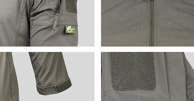High-Tech Fabric: Made with fire-repellent yarn for battlefield safety, featuring a Sorona®-infused recycled front fabric for fast drying and superior comfort. The flexible ripstop blend enhances durability and mobility.